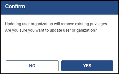 Updating the organization removes the existing user privileges. Click Yes in the pop-up to confirm changing the Primary organization.