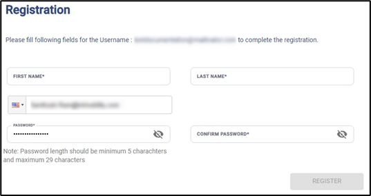 Click on Register Account button at the bottom of the email body. The user is directed to the Account Registration Page.