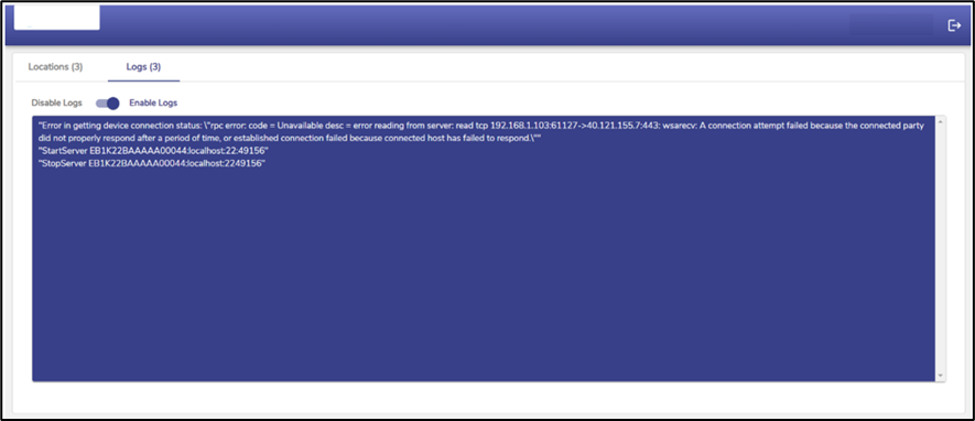 The Logs tab displays the list of actions performed by the user after they log in such as starting a connection, closing a connection or if the user encounters any error related to starting or stopping the servers. By default, the logs are enabled, but the user can opt to disable the logs as well. The logs shown here are only of that session and once the session expires the logs are erased. When the user logins again, the logs will be generated freshly for that session.