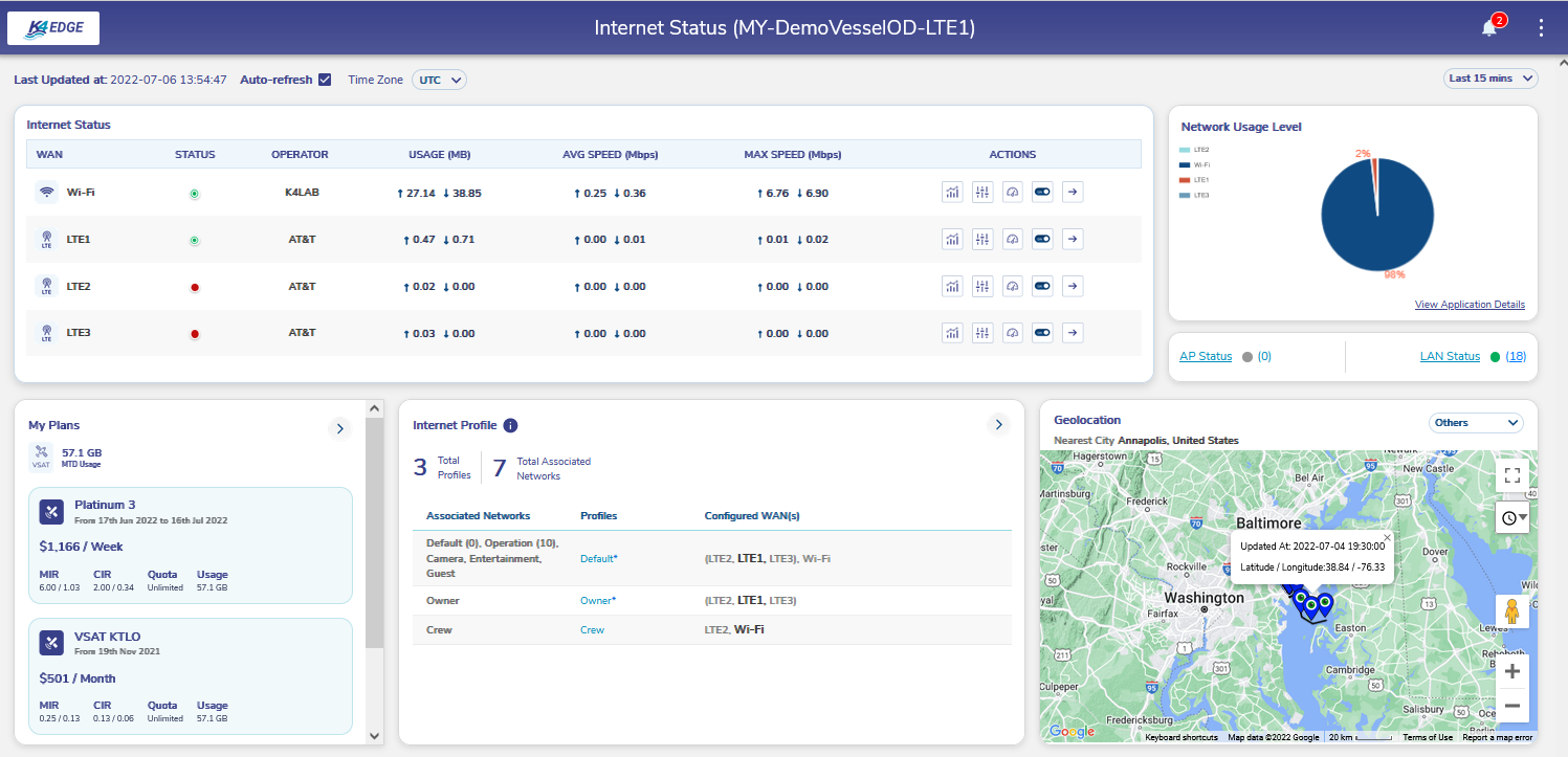 K4 learns/identifies the best performing network/provider/band based on the data analysis, which is created by the data learned from the K4 vessels connecting to various Cellular networks. This information is periodically send back to the K4 edge server and based on the location of the vessel, optimal SIM/cellular network is selected without any intervention needed from the customer.
