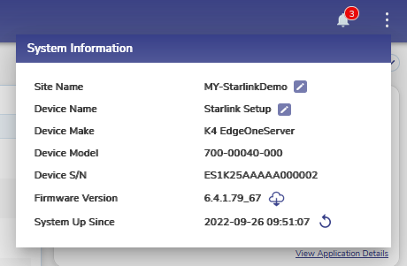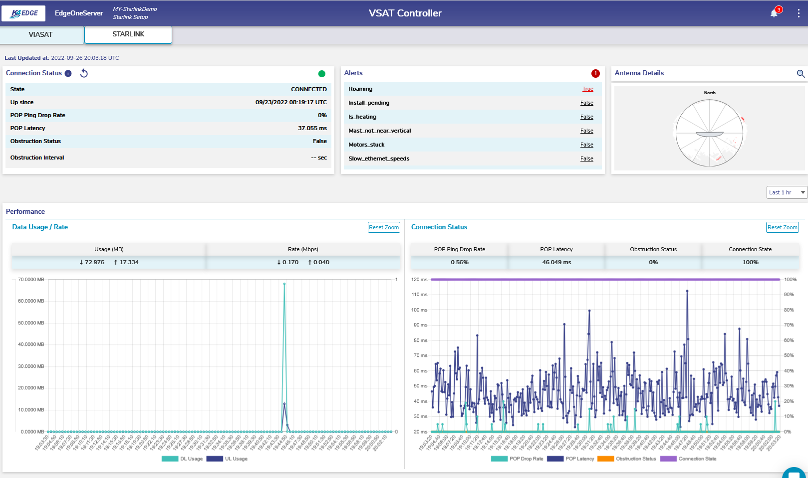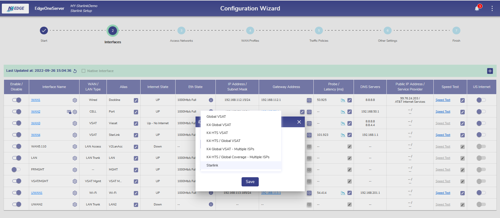 This release interfaces with the Starlink terminal (RV version) on vessel and presents the integrated view of the terminal performance, status from the Edge portal. To enable this controller functionality, click on the pencil icon in the Gateway Address column for the Starlink interface. Currently this is integrated as a type of VSAT link and in later releases Starlink will be treated as a separate interface type. Once the Starlink interface is configured, the controller can be access under the VSAT Controller menu.