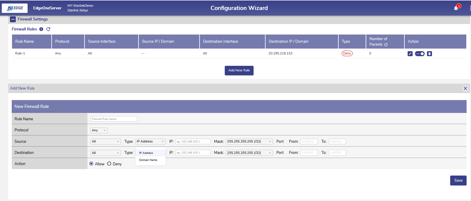 Firewall section of the configuration is updated to support Domain Name filters and also have an option to refresh the firewall rules.