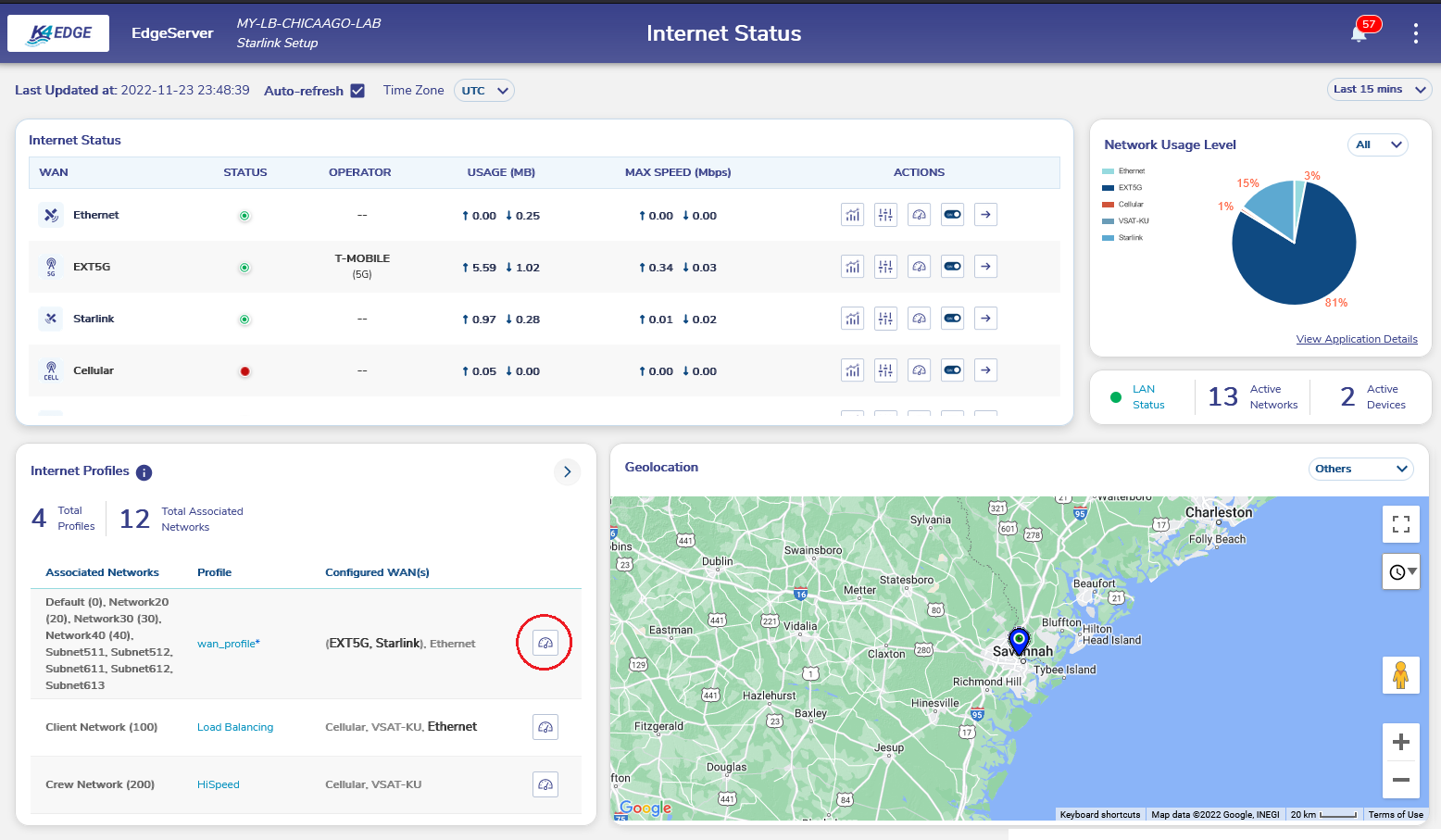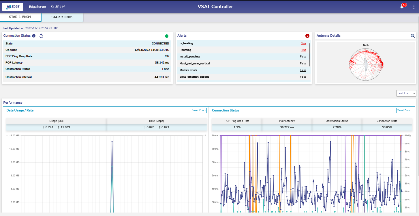 With release 6.5.0 Build 79, EdgeServer can support Maritime dual starlink terminals. On the VSAT controller page, can see the status of both the terminals by switching between the tabs. Along with the management interface, the system can handle the same interface gateway IPs on the terminals as well. There is no specific configuration is needed to enable this apart from selecting the WAN interface type as VSAT/Starlink.