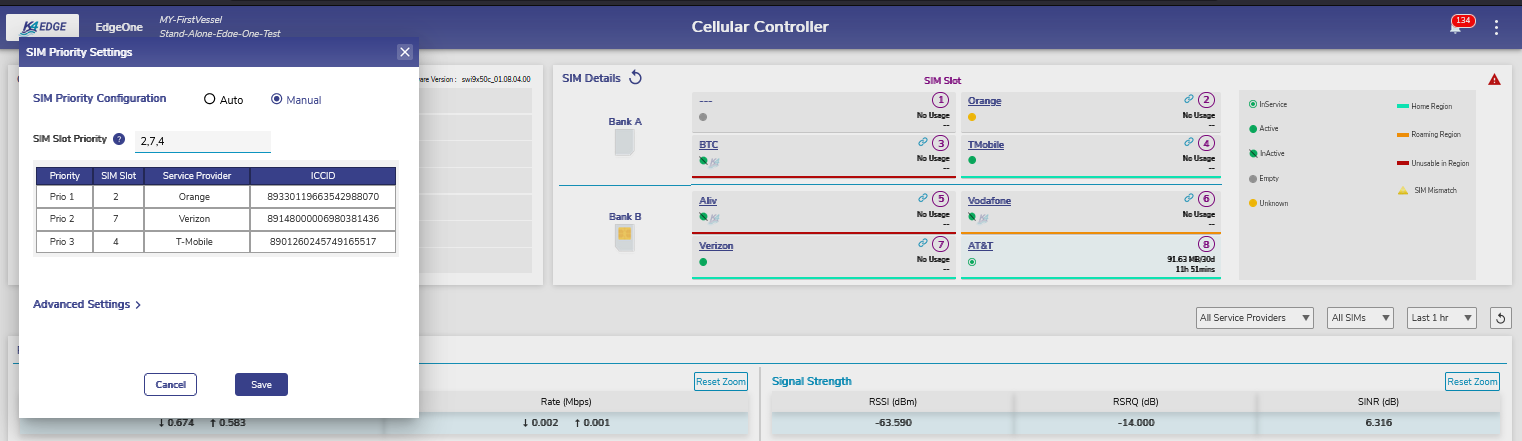This feature allows the administrator / user to configure the priority of the SIMs to be used. This feature is useful in case of EdgeOne, OneDome devices where there are 8 SIMs per device. Click on the pencil icon next SIMs listed under the Status section. On clicking the pencil, there is a pop up in which the SIMs can be entered as comma separated SIM Slot numbers in a prioritized order. For more advance settings like retrying the high priority SIM periodically or to set threshold for good call quality etc, click on the “Advanced Settings”. Note: Use caution while configuring the Advanced Settings as it might lead to constant call bounce or not connecting in poor areas etc.