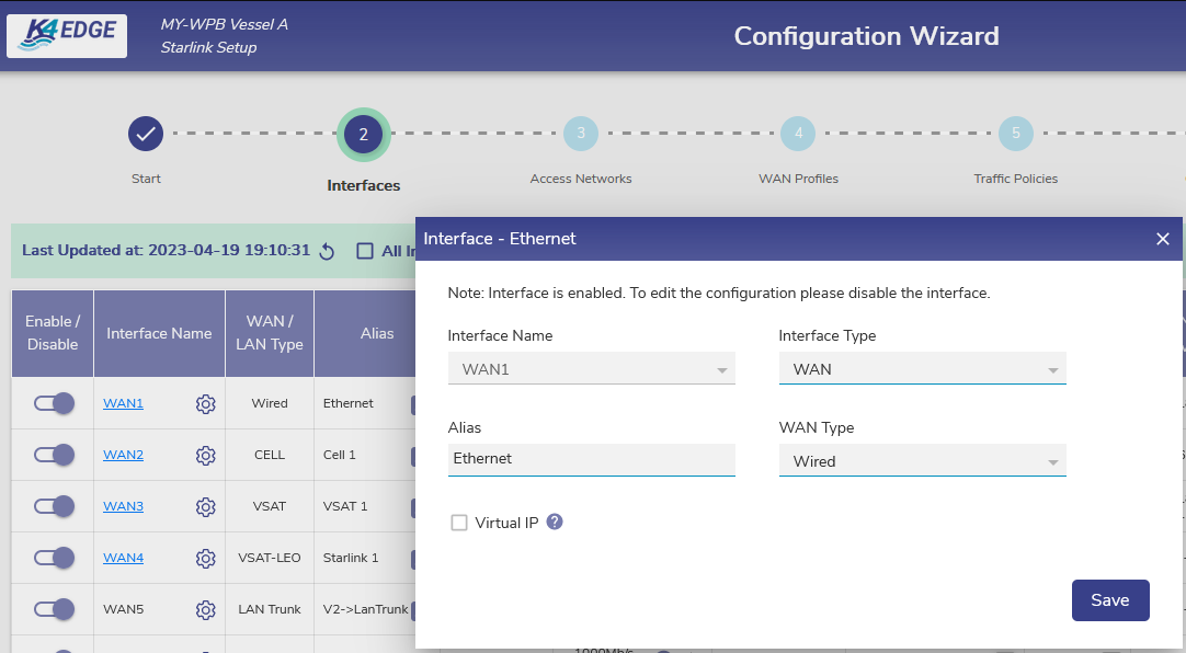 With dual starlink (maritime), both the terminals come up with the same network and gateway address causing IP conflict. In prior releases this was addressed just for starlink/VSAT-LEO interface. The same functionality is extended for other WAN interfaces as well, with the default option of being enabled only for VSAT-LEO. This option can be editable by clicking the gear icon against that interface in the Configuration Wizard. Virtual IP can be configured for any Ethernet based interface or sub interfaces. It won’t be applicable for in-build interfaces like Cellular or WiFi.
