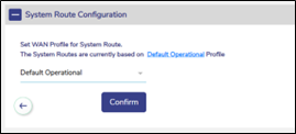 The user can select the specific WAN Profile for System Route using the System Route Configuration option. Using the selected WAN Profile, the management/operational traffic will be routed.