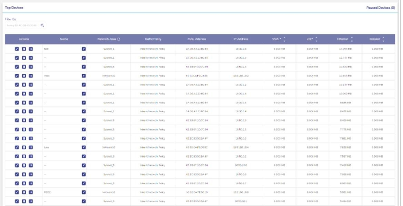 · Click Paused Devices on the top right of the Top Devices table, see Figure Paused Devices Link. The Paused Devices Pop-up appears, see Figure Resume Internet. This shows the list of paused devices in the system.
