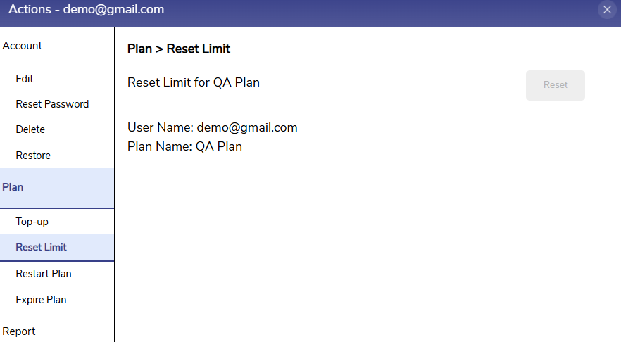 Click Reset Limit option from the left menu bar to reset the daily limit. Once the daily limits are exhausted, admin can reset the daily limits. This option is disabled for users with no plan or users with plan which does not have daily limits.
