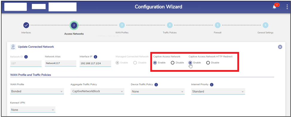 To configure an Access network as Captive, the admin must first create the Network Traffic Policy and the network must be configured as Captive Access Network in the KonnectOS Portal.