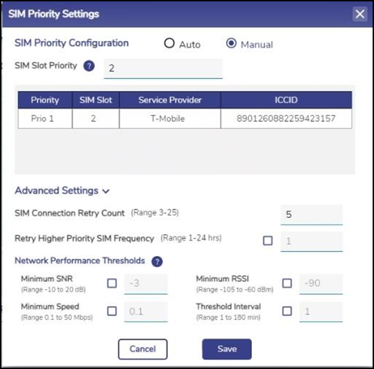 User can click Advanced Settings to update the remaining fields such as SIM Connection Retry Count and Network Performance Thresholds, see Figure SIM Priority Advanced Settings.