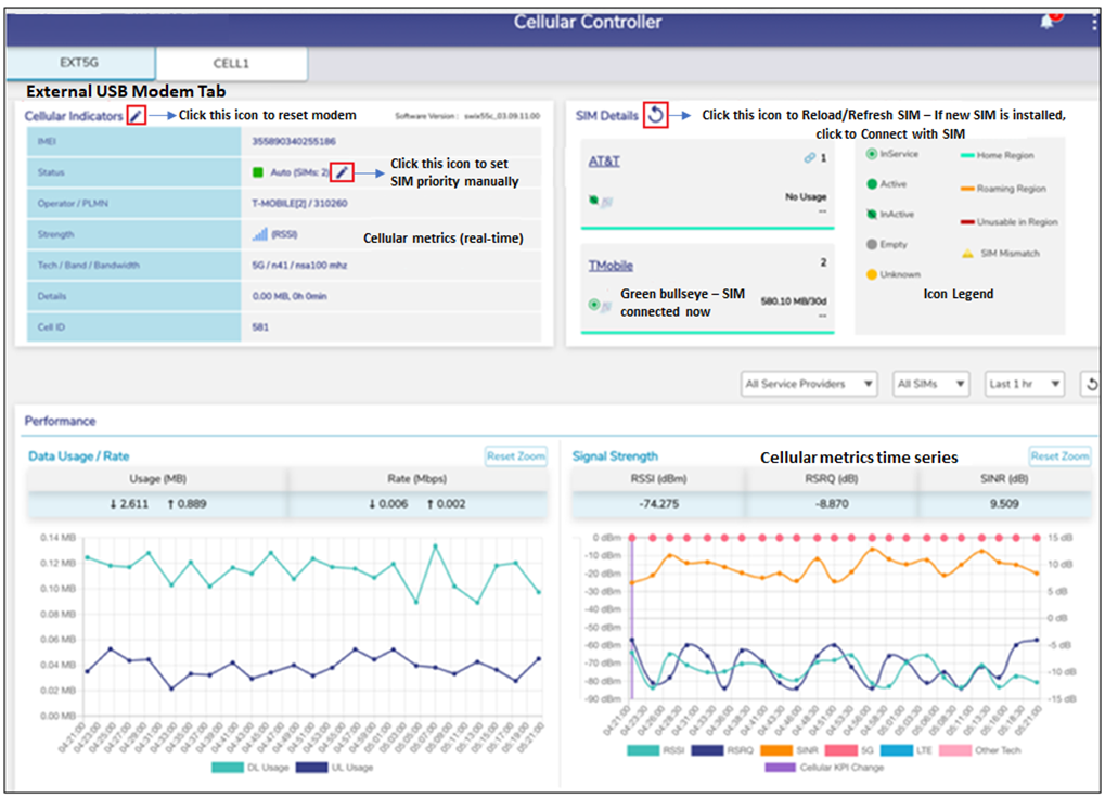 For the example shown here, there are two tabs, first for CELL 1 (an external cellular source) and a second for Ext5G (the External USB Modem).