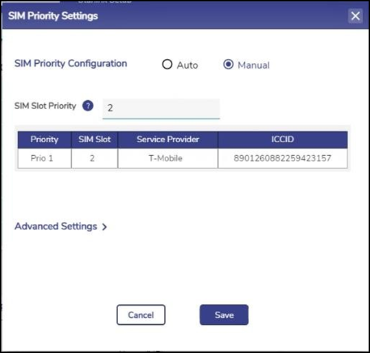 Enter the SIM Slots in priority order of the preference, see Figure 6 SIM Priority Settings - Manual.