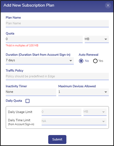 Daily Usage Limit – Amount of data entered by user should be less than the entered Quota. By default, it is populated with Quota / Duration.