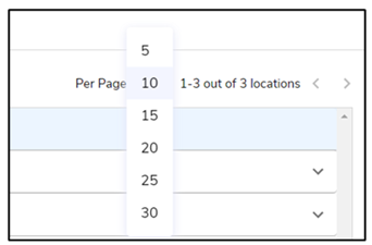 When the user adds many sites under the Locations tab, the pagination helps the user navigate to each page by using the < > buttons. User can also choose the number of sites to be seen in a single page. By default, the count will be 10. The minimum count is 5. Users can display up to 30 devices in one page.