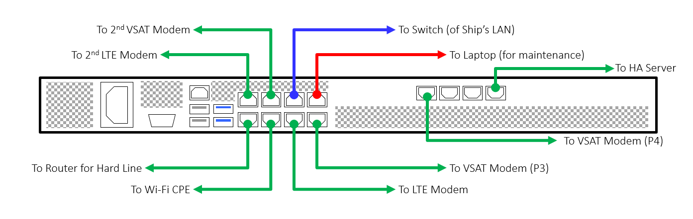 The ship’s LAN connects wired & wireless devices on board the site. The WAN access equipment (e.g. VSAT modem, LTE modem, Wi-Fi CPE for marina Wi-Fi, etc.) provide connections to the Internet.