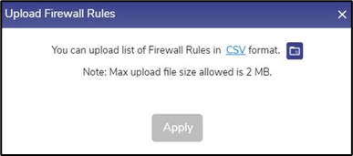 The user can upload the Firewall Rules in CSV format also. Click the Upload icon to open the Upload Firewall Rules pop-up.