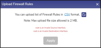 User can check the validation errors, rectify them in the CSV file and upload the file again to upload the Firewall Rules.
